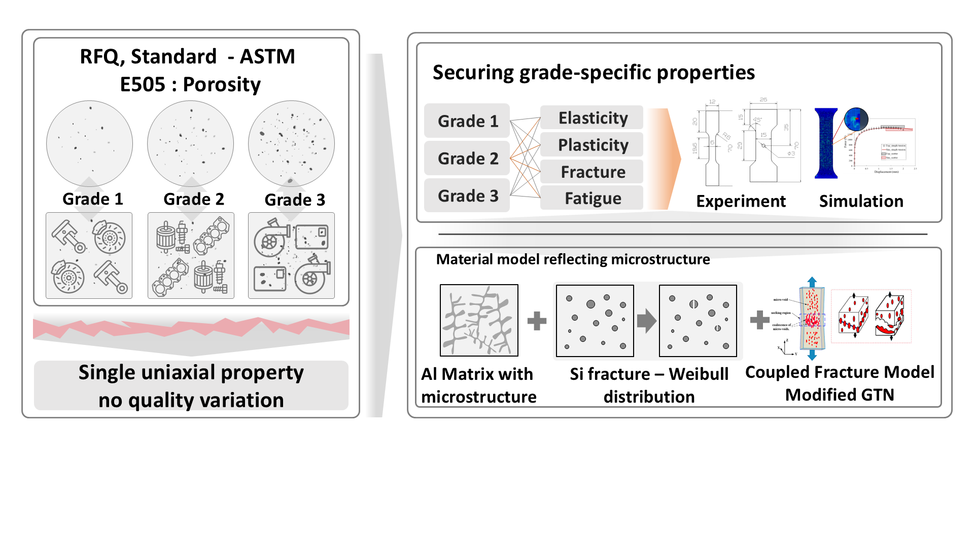 이경민, 홍승효, 이응민A multi-scale fracture modeling framework that predicts failure evolution in die-cast aluminum by integrating ASTM E505 porosity standards with a modified GTN damage criterion.